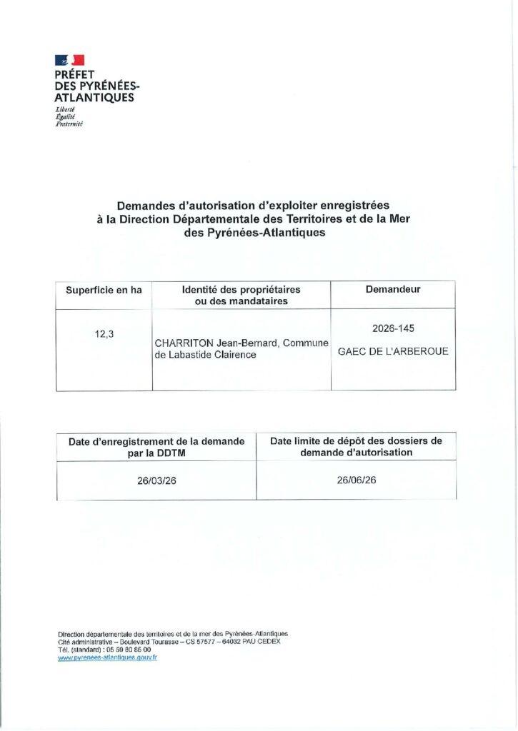 Dépôt des candidatures auprès de la DDTM avant le 26/06/2026.